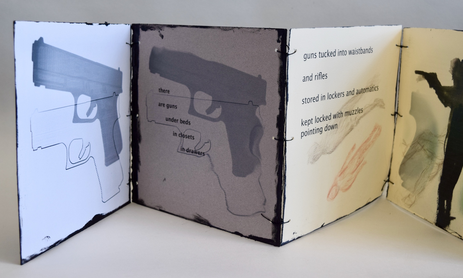 I began working about gun violence several months ago. Mass shootings keep happening in this country. This is a double-sided accordion and I've included the names of cities where mass shootings have occurred and the list keeps going on. It was not always like this. I'm a grandmother and I did not worry about my children being slaughtered at school. My grandsons have already had a lockdown experience because of an active shooter in their neighborhood. Tragically, guns seem to have become the "new normal" in America. This is a 9 page double-sided accordion of inkjet prints with mixed media, joined by knotted thread.