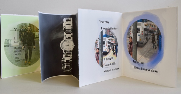 This accordion book is about the pandemic experience – the dwindling of life into a sequence of daily tasks, time seeming to move at a crawl and, yet, uncounted moments slipping by. This work both looks out at our more limited world and inside at the incessant movement of our hours. The pages that have images about time are in black and white and smaller paper, making the viewer hesitate to turn the pages just as we stop and start throughout the day. Edition of 5