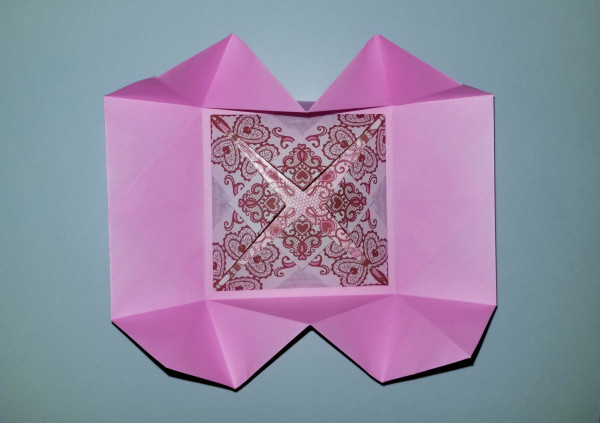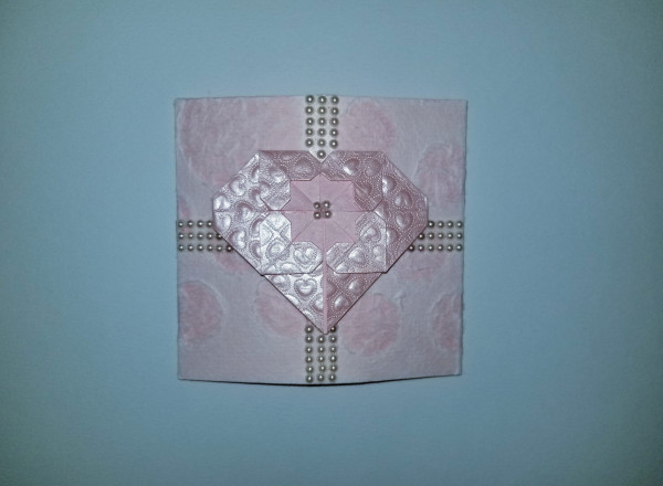 As a gesture of expressions of thoughts, gratitude or simply affection of saying I love you", on a innocent unblemish mind of a young lassie she picks a unique piece. Small enough to be held by her dainty hands is proportionately crisply folded flat item that emulates a gift box wrapped in powdery pink. Rows of simulated seed pearls to tie it up. A heart embossed origami applique in which a heart shaped four petaled flower blooms out that replaces the traditional bow.