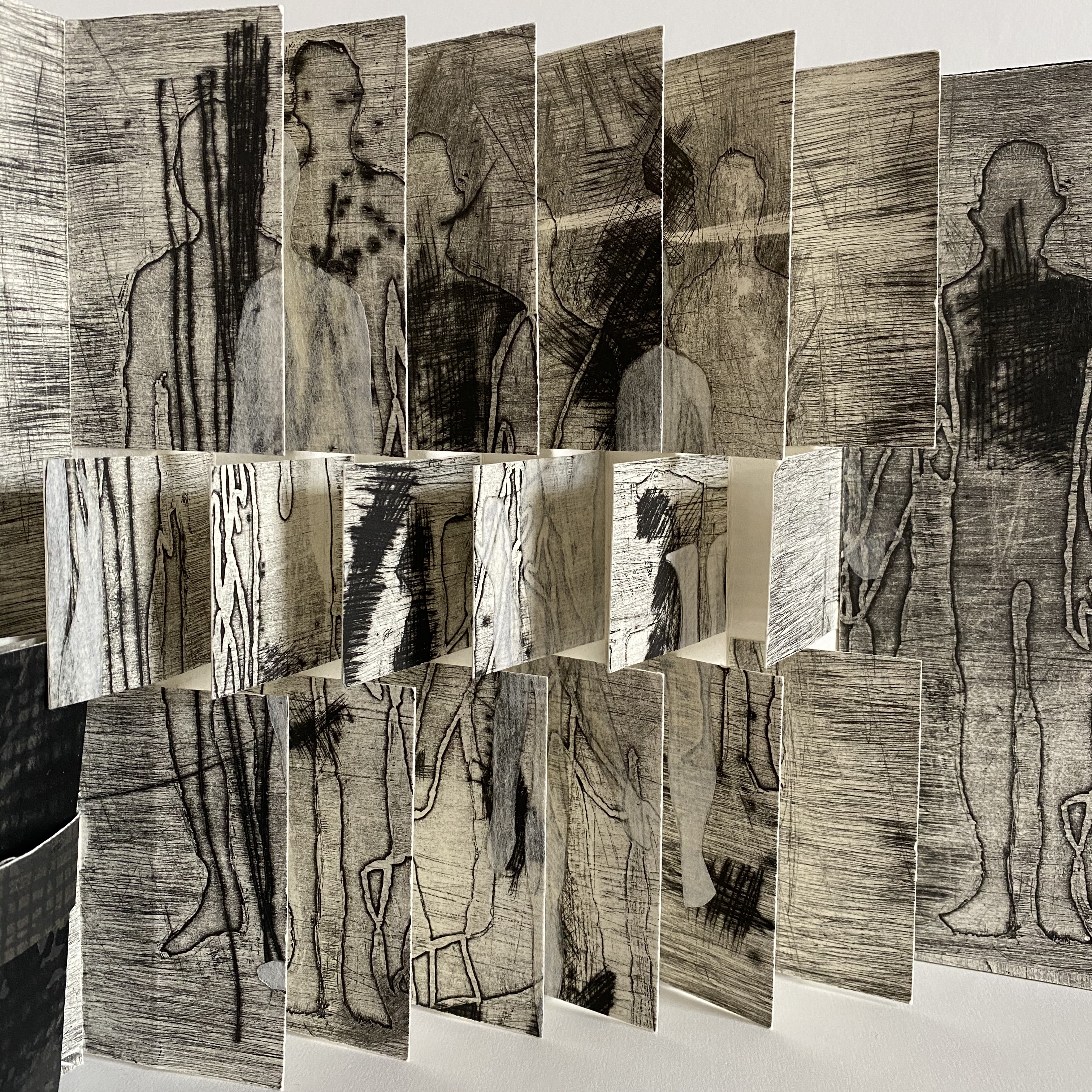 It is Not in the Healing We Are Made Whole is a book about confronting past wounds and repressed emotions to gain a deeper understanding or emergence of oneself. This is depicted through a flag book with an etched silhouette, repositioned, repeated and layered with new marks and varying opacities. As individuals explore the representation of the inner self, they uncover aspects of their identity, trauma, or needs, through mark making, text, and repetition. This in turn represents a crucial first step toward authentic healing. An accompanying pamphlet illustrates how each layer of self-discovery as new facets of identity emerge.