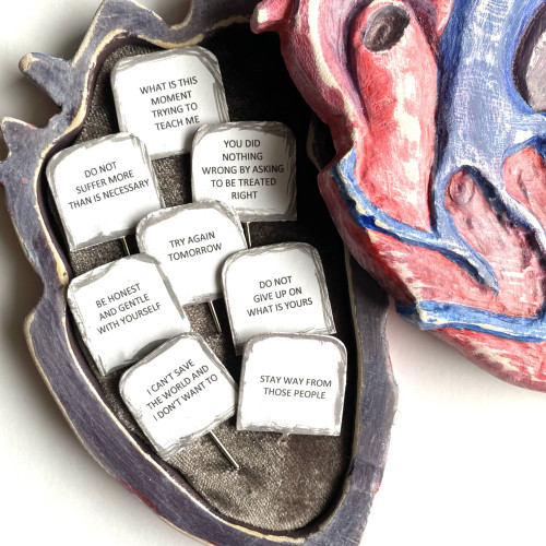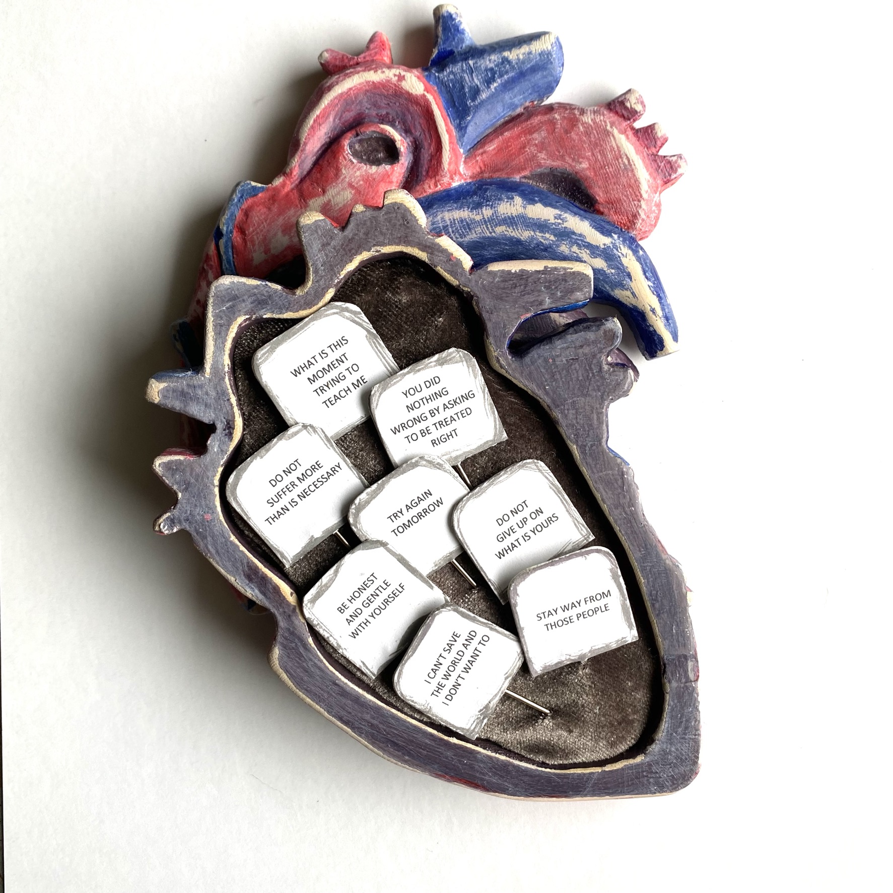 Advice Taken to Heart is a heart-shaped wooden book object that embodies the dual nature of discovering and cherishing meaningful words. The hidden pins within, each bearing delicate text, represent the balance between holding onto advice and letting it go. When these messages are worn, they become personal tokens—either as “armor” or as gentle reminders—allowing one’s inner desires or guidance to emerge and merge with their identity. The choice of materials adds layers of emotional resonance: wood symbolizes warmth and strength, velvet offers comfort, and steel signifies resilience.