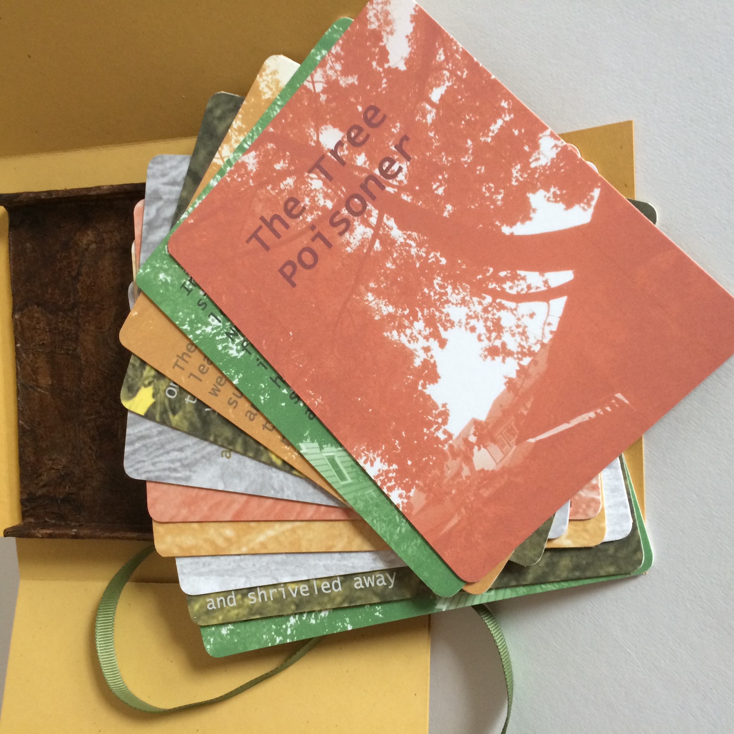 The Tree Poisoner tells the story of a neighbor who trespasses to poison a large tree that spans two properties. The narrative unfolds gradually, using imagery and text to deepen the reader's sense of discovery or emergence of the truth. Different paper textures and printing techniques engage touch: The rough cradle holding the cards mirrors the bark and possibly the hidden deed, while the smooth cards within evoke the tree’s vulnerable core, its essence stripped away.