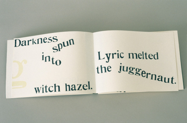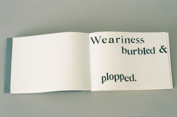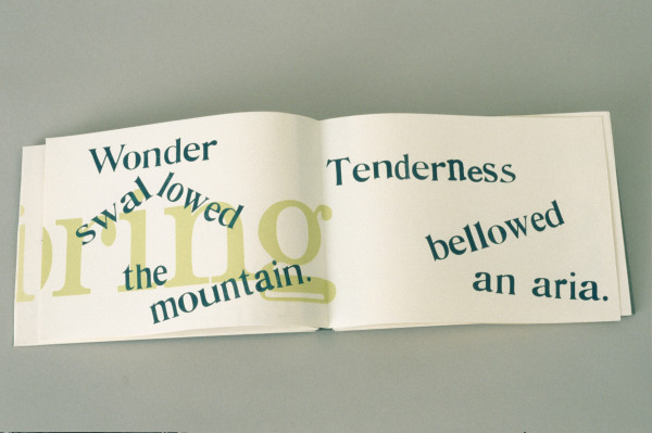 Spring Tongue-Tied the Ocean captures the wonder of the coming of spring. Spring comes slowly as one turns the pages, beginning with the melting of winter: “Weariness burbled and plopped.” With each turn the word SPRING enters from the left, at first just part of the “g”ß printed only slightly darker than the page itself until on the final spread the full word presents itself in a vibrant green. As the letters spelling SPRING deepen in color, the primary text, which dances across each page, turns from near black to a blue.